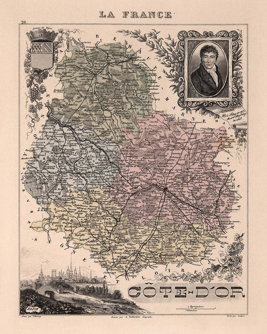 A tour of the map reveals a landscape shaped by both nature and human endeavor. Rivers and waterways wind through the countryside, nourishing the fertile soils that have made Côte-d'Or synonymous with world-class wines. Rolling hills and dense forests are artfully depicted, reflecting the region’s varied topography and natural beauty. The administrative boundaries are crisply delineated, providing a snapshot of the political organization of the era. Vuillemin’s vignettes further enrich the scene, showcasing the agricultural activities, local fauna, and notable figures that have contributed to the department’s enduring legacy.