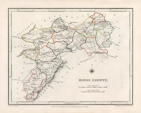 Posee un pedazo de historia con este mapa antiguo de Offaly (King's) de Samuel Lewis en 1844. Sumérgete en el rico patrimonio y la cautivadora belleza del condado de Offaly (King's), Irlanda, mientras exploras los pueblos, ciudades y monumentos históricos que dio forma a esta notable región.