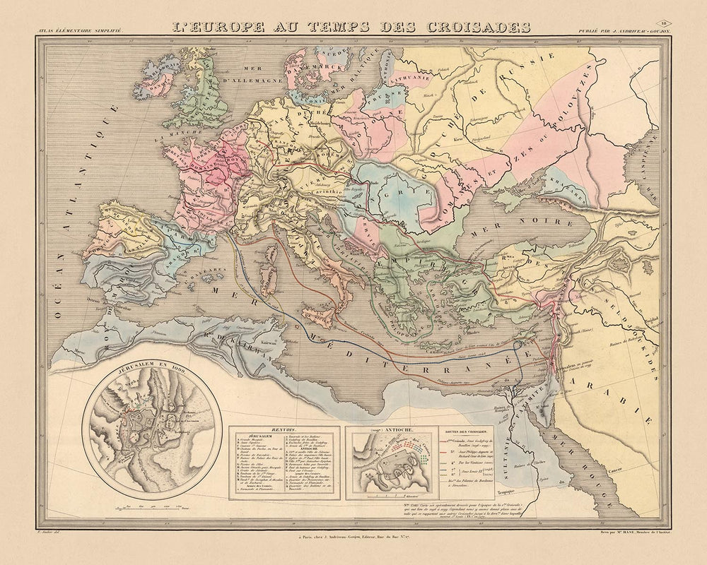 El mapa ofrece una visión completa de Europa, el Mediterráneo y Oriente Próximo, destacando regiones clave como el Imperio bizantino y Tierra Santa. Sus recuadros detallados de Antioquía y Jerusalén ofrecen una mirada más cercana a estos lugares fundamentales, con estructuras meticulosamente identificadas en una tabla informativa. Este nivel de detalle subraya el propósito educativo del mapa, probablemente sirviendo como un recurso para que los estudiantes del siglo XIX exploren la compleja historia de las Cruzadas.