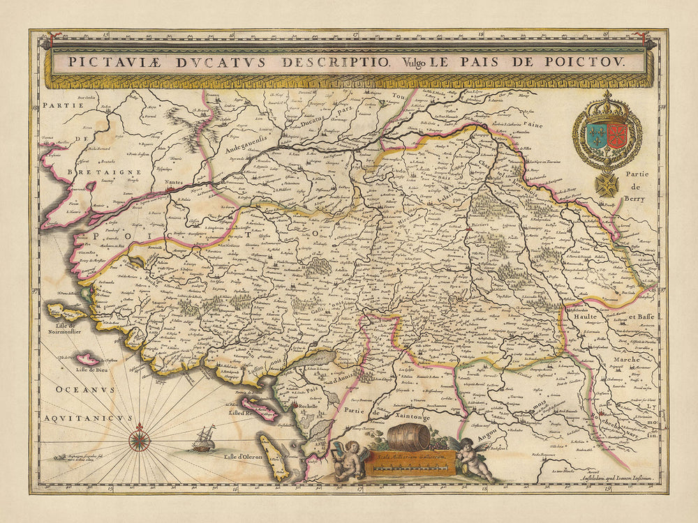 Adéntrese en las páginas de la historia con el mapa 'Pictaviae Ducatus Descriptio, Vulgo Le Pais De Poictou', una exquisita obra de arte de Nicolaes Visscher II. Este mapa, creado en 1690, representa de manera intrincada el Ducado de Poitou, una región histórica ubicada dentro de las fronteras modernas de Francia. El nombre completo del mapa se traduce como "Descripción del ducado de Poitou, comúnmente conocido como el país de Poitou", y proporciona una visión completa de las divisiones políticas y regionales de la época.
