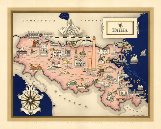 Además de su atractivo estético, este mapa también es un valioso documento histórico. El mapa proporciona una instantánea de Emilia en la década de 1930, un tiempo de grandes cambios y agitación en Italia. El mapa muestra la región antes del estallido de la Segunda Guerra Mundial y ofrece un vistazo a las vidas de las personas que vivían allí en ese momento.
