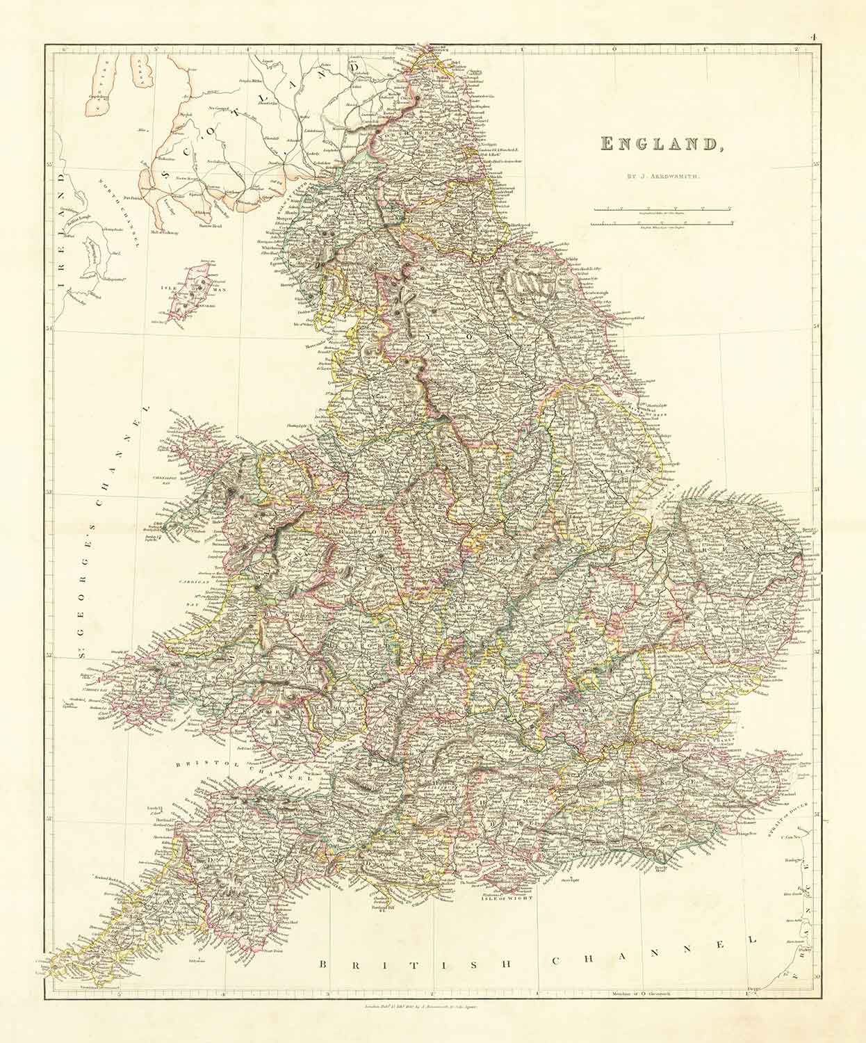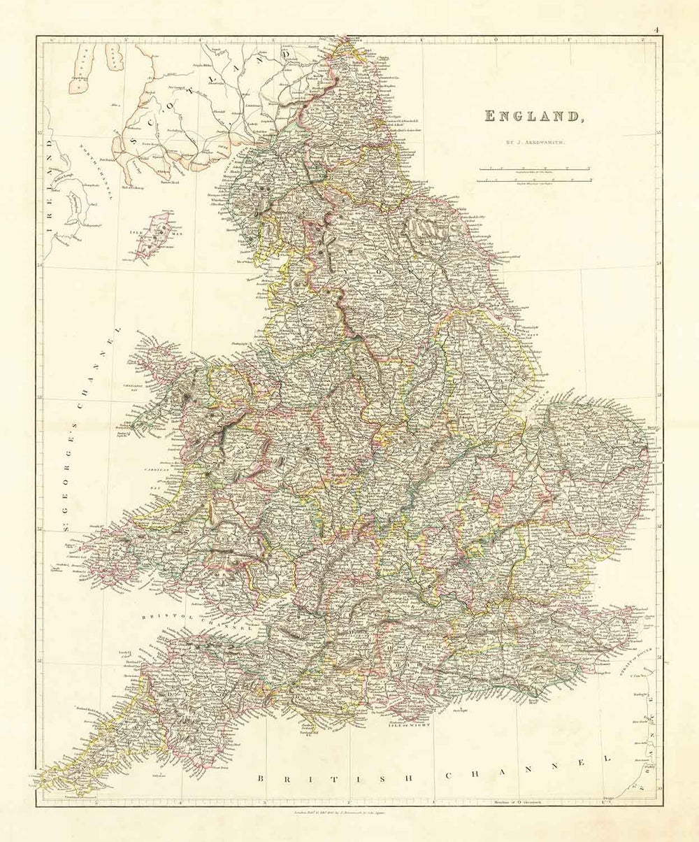 Antiguo mapa de Inglaterra y Gales en 1832 por John Arrowsmith: Ciudades, condados, carreteras, ferrocarril