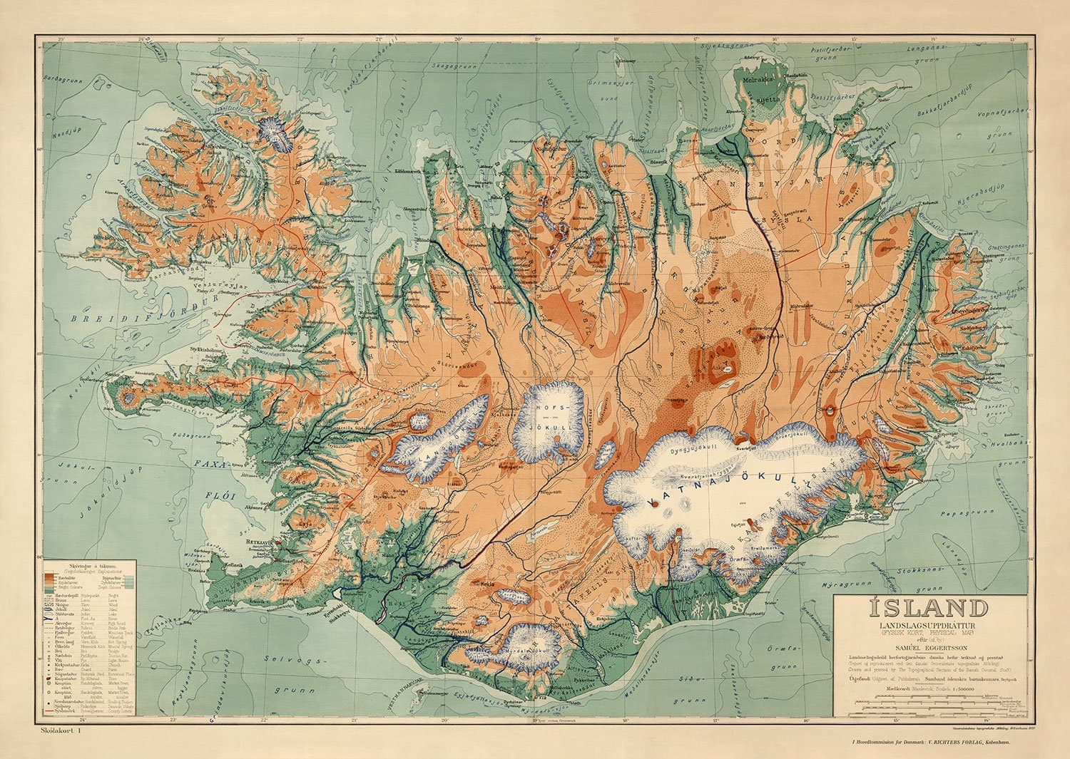 Un mapa encantador, colorido, antiguo y educativo de Islandia reunido por Samuel EggTertsson y publicado en 1928.