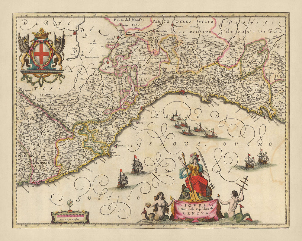 Mapa antiguo de Liguria y República de Génova por Visscher, 1690: La Spezia, Niza, Turín, San Remo, Parque Natural de los Alpes Marítimos