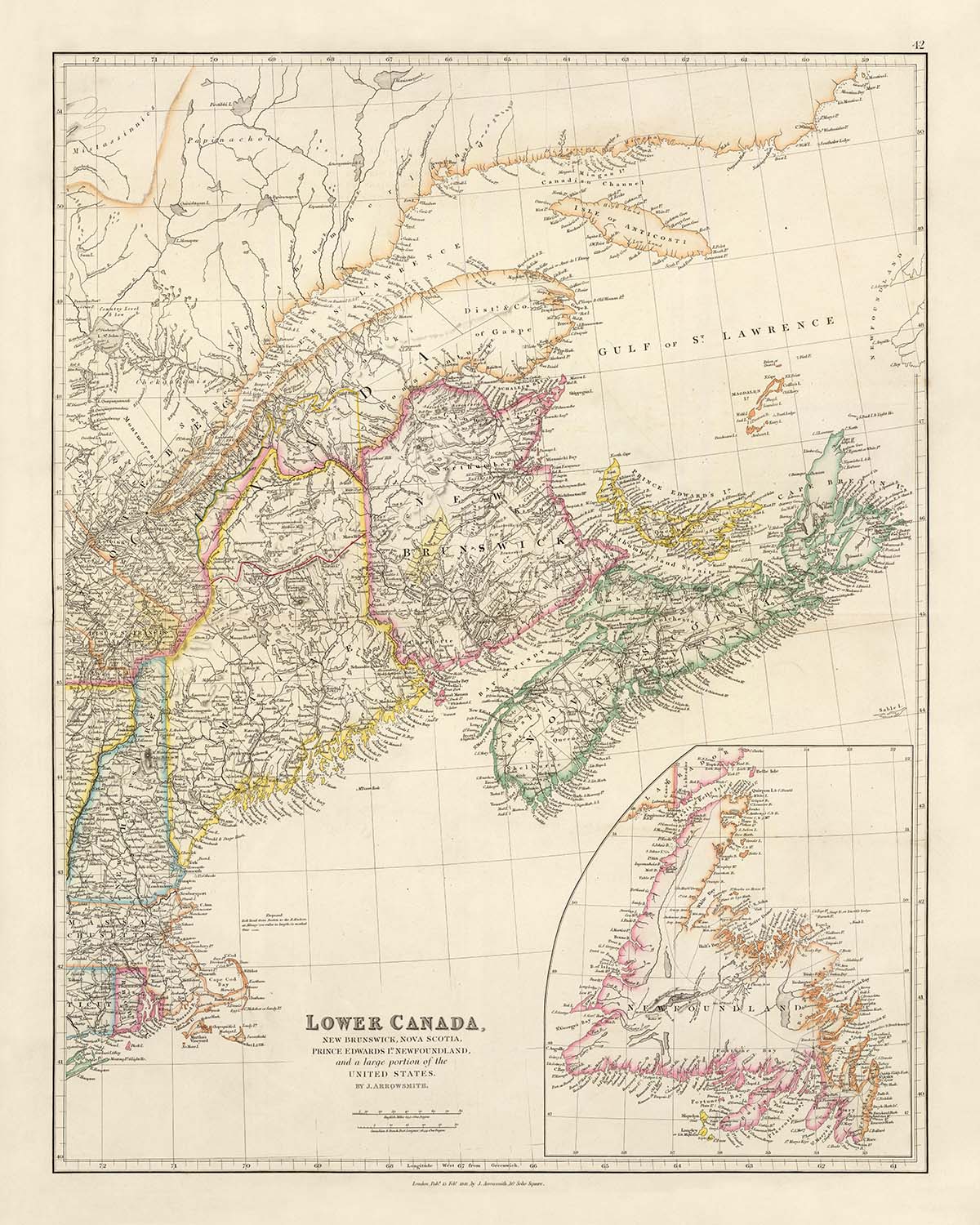 Sumérgete en el rico tapiz de la historia con el mapa titulado "Canadá Inferior, Nuevo Brunswick, Nueva Escocia, Isla del Príncipe Eduardo, Terranova y partes de los Estados Unidos," elaborado por el estimado cartógrafo John Arrowsmith en 1844. Este mapa es un testimonio de la habilidad y precisión inigualables de Arrowsmith, capturando los intrincados paisajes políticos y físicos de la época. Su trabajo es celebrado por su claridad y elegancia, marcando una evolución significativa en el arte de la cartografía. Con su color de contorno distintivo, este mapa se erige como un faro de modernidad en el siglo XIX, ofreciendo una ventana al pasado con belleza y precisión.