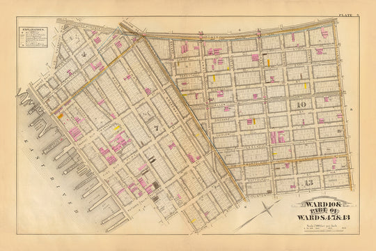 Este exquisito mapa data de 1879, una creación del estimado cartógrafo GW Bromley, y muestra un segmento del vibrante pasado de la ciudad de Nueva York. Ilustra las complejidades del distrito 10 del Lower East Side, junto con partes de los distritos 4, 7 y 13. El mapa es una litografía coloreada a mano que no solo delinea calles y cuadras con precisión excepcional, sino que también resalta el entorno construido de la época. , incluidos edificios, ferrocarriles de vapor e incluso el flujo de cursos de agua originales.