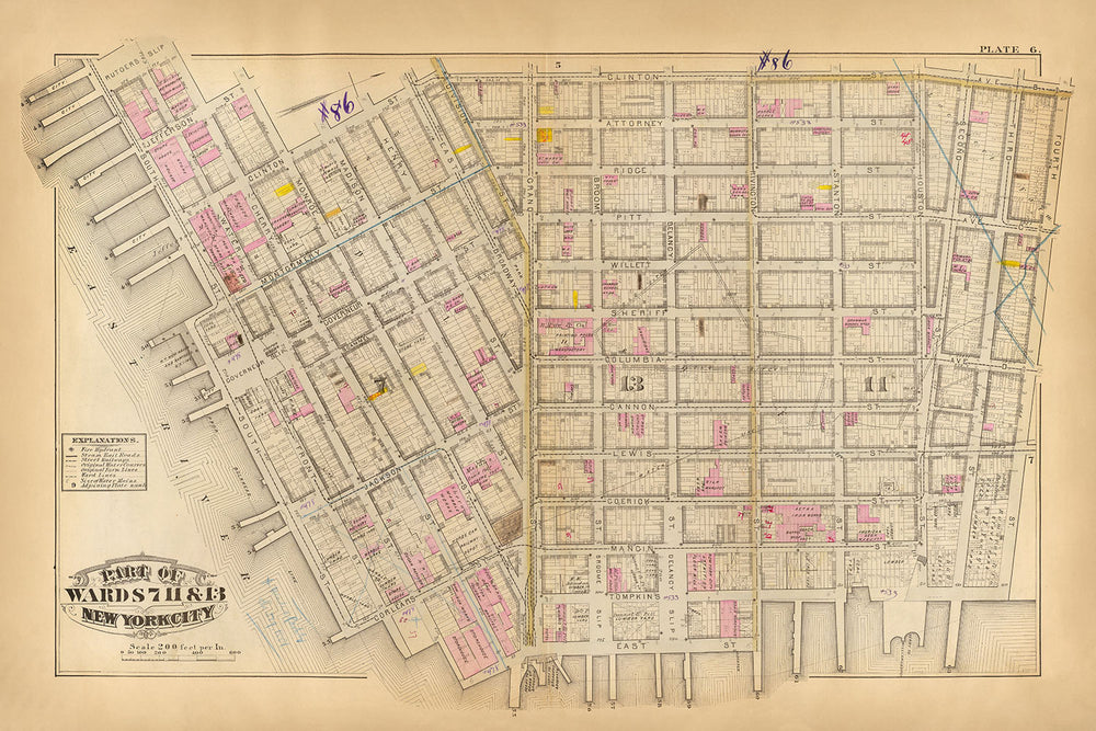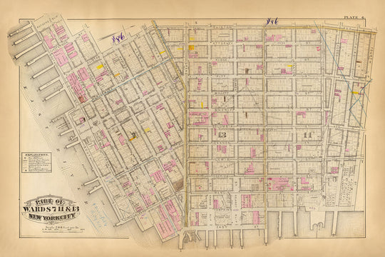 Este mapa litografiado coloreado a mano, que presenta un exquisito documento cartográfico de finales del siglo XIX, presenta una descripción detallada de partes de los distritos 7, 11 y 13 de la ciudad de Nueva York, cubriendo específicamente un área del histórico Lower East Side. Publicado en 1879 por GW Bromley, este mapa es un rico archivo visual de la vida urbana durante un período transformador en la historia de la ciudad.