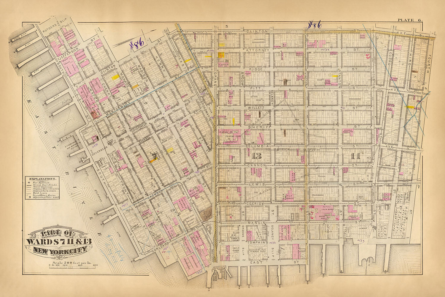 De particular interés son las anotaciones que se han agregado con el tiempo, lo que sugiere un documento vivo al que se ha hecho referencia y se ha utilizado para diversos fines. Estas anotaciones sirven como notas históricas a pie de página, brindándonos vislumbres de la narrativa actual de la evolución de la ciudad. El mapa también muestra las dimensiones de los bloques, lo que permite una vista granular de la red urbana que ha definido la geografía del Lower East Side.