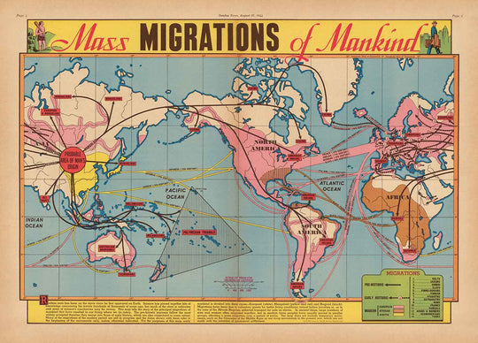 Esta maravillosa antigua mapa de las Migraciones Masivas de la Humanidad fue publicada originalmente en 1944. Fue creada por Edwin Sundberg.