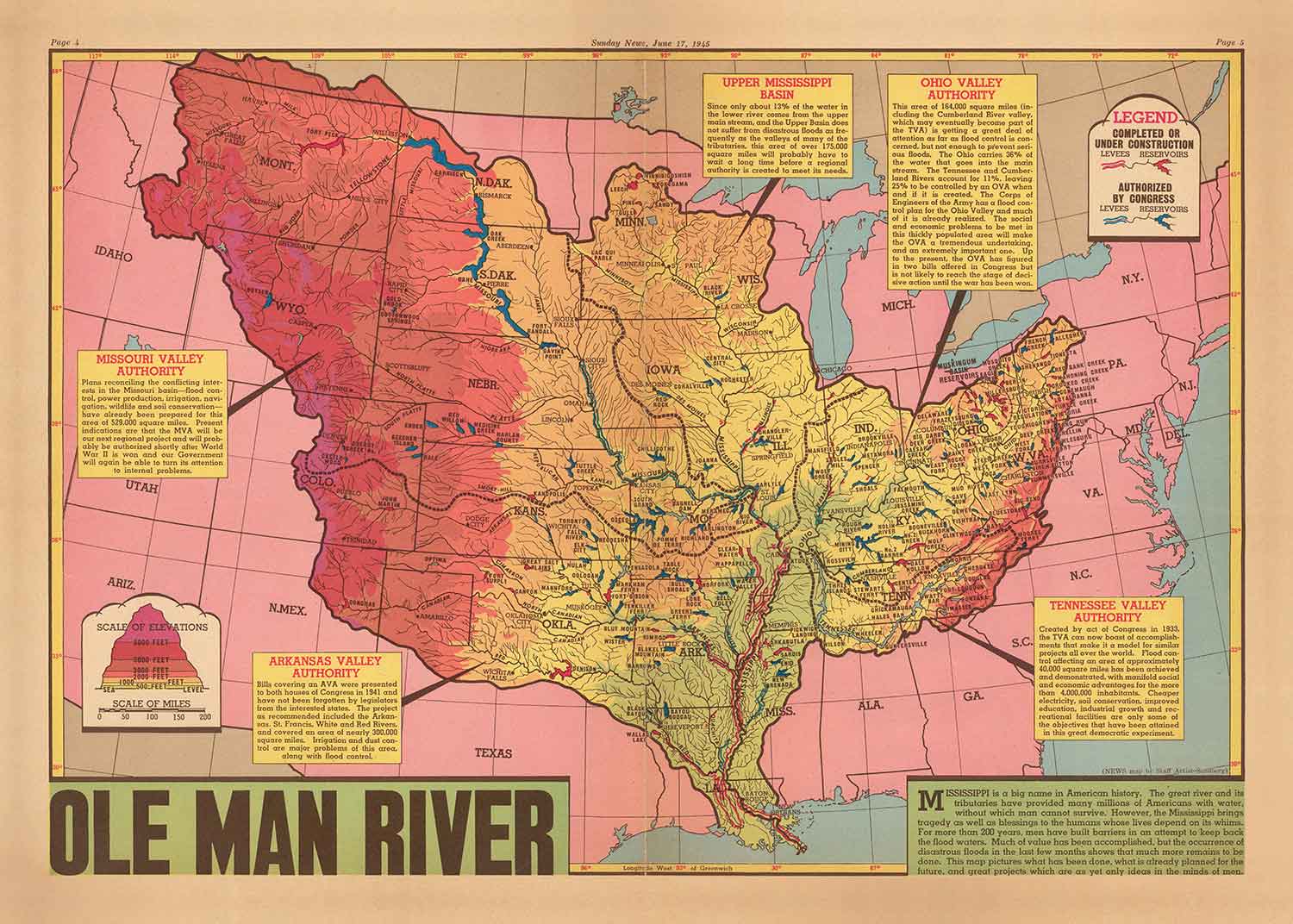 Antiguo mapa de la cuenca del río Mississippi, 1945: "Ole Man River"