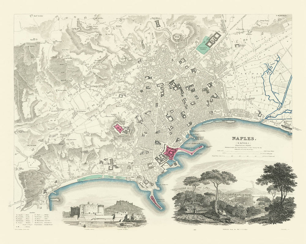Mapa antiguo de Nápoles por SDUK, 1835: Castello Nuovo, St. Elmo, Posilipo, Toledo, Gran Puerto