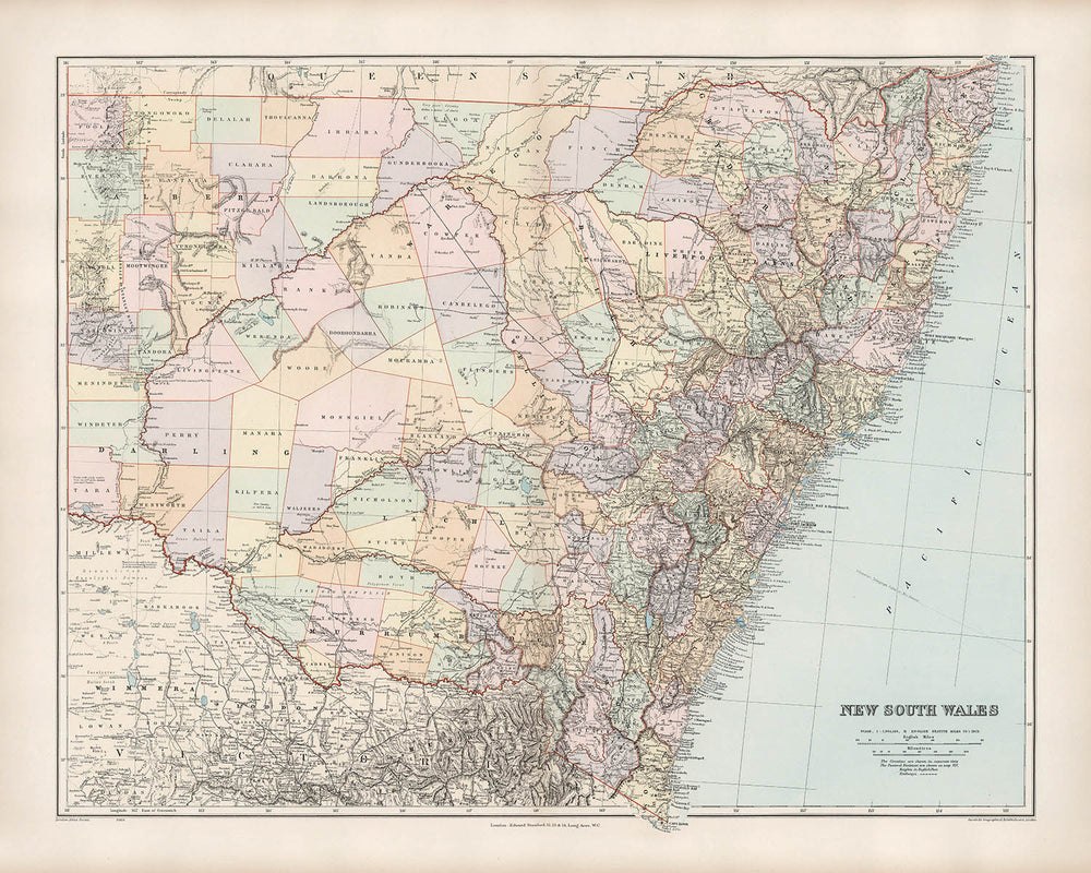 El mapa titulado "Nueva Gales del Sur" de Edward Stanford, elaborado en 1904, es un testimonio del arte de la cartografía en el cambio del siglo XX. Stanford, una figura prominente en el mundo de la elaboración de mapas, adquirió las planchas del Atlas de Londres de John Arrowsmith, lo que le permitió construir sobre un legado de documentación geográfica detallada. Este mapa es parte de un atlas emitido por primera vez en 1887, sucediendo al trabajo de Arrowsmith de 1858. El diseño intrincado y la litografía a todo color vibrante lo convierten en una pieza destacada, reflejando tanto paisajes políticos como físicos con precisión y arte.