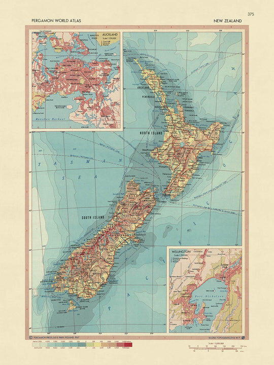 Este mapa de Nueva Zelanda de 1967, publicado por el Servicio de Topografía del Ejército Polaco, es un mapa político y físico detallado que proporciona una descripción completa de la geografía y las divisiones políticas del país. La escala del mapa es 1:2.500.000, lo que lo convierte en un recurso ideal para viajeros, historiadores y cualquier persona interesada en la geografía de Nueva Zelanda.