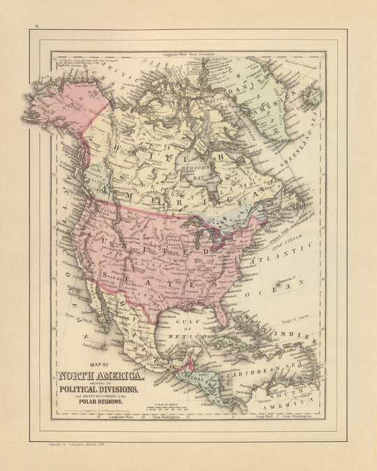 El "Mapa de América del Norte. Mostrando sus divisiones políticas y descubrimientos recientes en las regiones polares" es una creación magistral del estimado cartógrafo Samuel Augustus Mitchell, publicada en 1884. Este mapa captura el paisaje geopolítico de América del Norte durante un período de importante exploración y evolución territorial. Destaca las fronteras políticas de los Estados Unidos, México, América Central y un Canadá notablemente pequeño, que en ese momento consistía sólo en Columbia Británica y partes de Ontario y Quebec. La extensión restante de lo que ahora conocemos como Canadá se denomina "América británica", lo que refleja las perspectivas coloniales de la época.