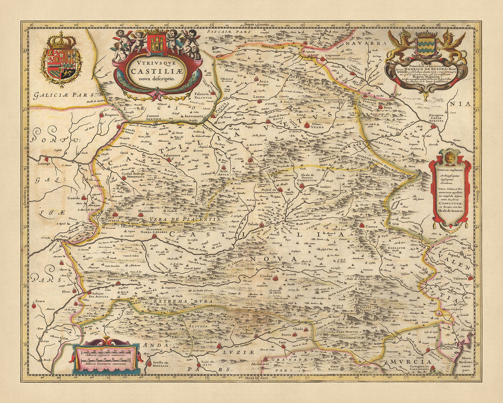 Una característica única de este mapa es su capacidad para contar una historia. El mapa 'Utriusque Castiliae nova descriptio' no sólo representa la disposición geográfica de las Castillas Vieja y Nueva sino que también refleja el contexto político e histórico de la época. La descripción detallada del mapa de los límites administrativos y las ciudades ofrece una visión de las divisiones políticas y la dinámica de poder del período. La inclusión de bosques, vías fluviales y montañas proporciona información sobre el paisaje natural y los recursos que dieron forma a la historia y la cultura de la región. Este mapa es más que una herramienta geográfica; es una ventana al pasado que ofrece una comprensión más profunda de la rica y compleja historia de España.
