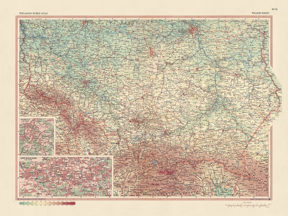 Este mapa de 1967 del sur de Polonia, publicado por el Servicio de Topografía del Ejército Polaco, es un mapa político y físico detallado que proporciona una visión completa de la región. El mapa cubre la mitad sur de Polonia, con Varsovia y Poznań en el borde superior del mapa. Incluye insets de Wałbrzych y la Cuenca de Silesia Superior.