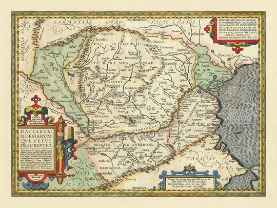 Abraham Ortelius, el renombrado cartógrafo, creó el "Daciarum, Moesiarumque, Vetus Descriptio" en 1603, un mapa que captura vívidamente la esencia histórica y geográfica de la antigua Dacia y Moesia. Esta exquisita pieza, parte del Parergon de Ortelius, el primer atlas histórico del mundo, es un testimonio de su profunda curiosidad por la antigüedad clásica. El mapa se extiende desde Alemania en el oeste hasta el Mar Negro en el este, y desde Europa del Este en el norte hasta Grecia en el sur, ilustrando meticulosamente las regiones que corresponden a la actual Rumanía y Bulgaria. La dedicación de Ortelius a la precisión histórica y al detalle es evidente en cada aspecto de este mapa, convirtiéndolo en un valioso artefacto tanto para historiadores como para coleccionistas.