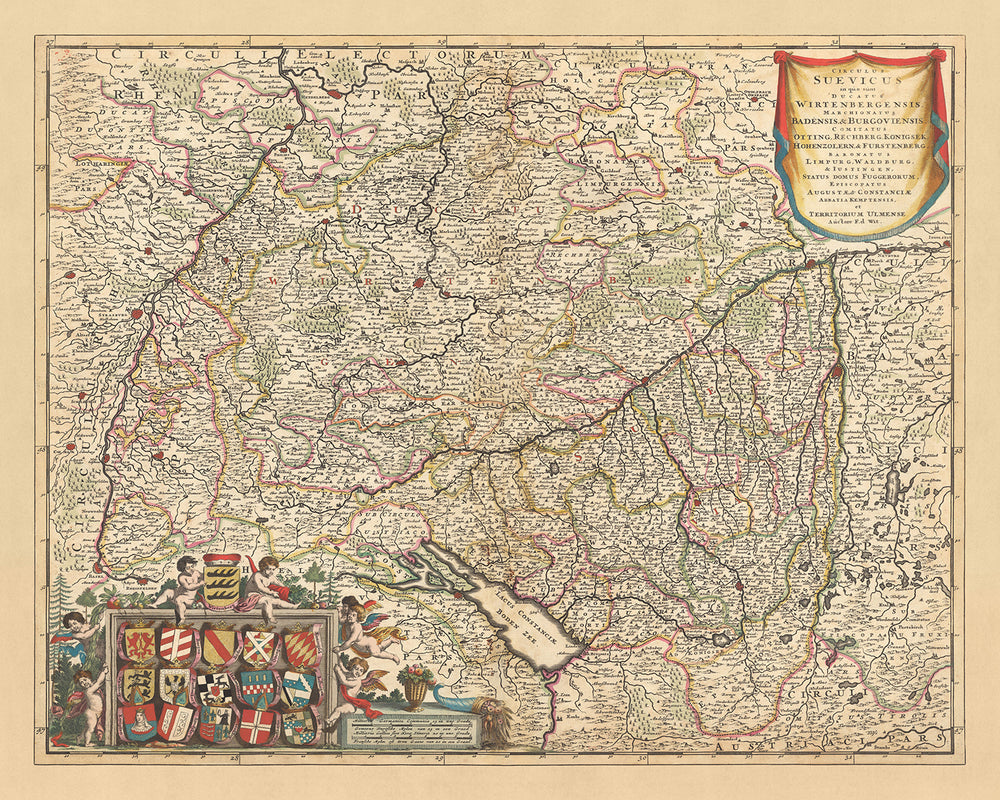 El título completo en latín del mapa, 'Circulus Suevicus in quo sunt Ducatus Wirtenbergensis, Marchionatus Baensis et Burgoviensis Comitatus Otting et Territorium Ulmense', se traduce como 'Círculo de Suabia en el que se encuentran el Ducado de Württemberg, el Margraviato de Baden y Burgau, el Condado de Oettingen. y el territorio de Ulm. Este título describe acertadamente las divisiones políticas de la región a finales del siglo XVII.