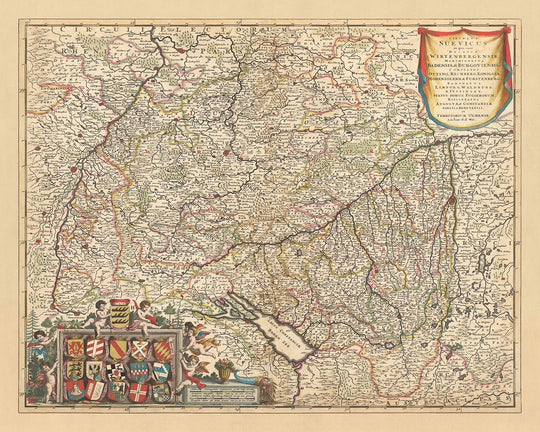 Sumérgete en los intrincados detalles de este extraordinario mapa de 1690 del Círculo de Suabia, meticulosamente elaborado por el renombrado cartógrafo Nicolaes Visscher II. Esta notable pieza de la historia muestra no sólo las proezas geográficas de la Edad de Oro holandesa, sino también los paisajes políticos y culturales de la época. El Círculo de Suabia, conocido como 'Circulus Suevicus' en latín, fue un importante Círculo Imperial del Sacro Imperio Romano Germánico, que abarcaba gran parte de lo que hoy es el sur de Alemania.