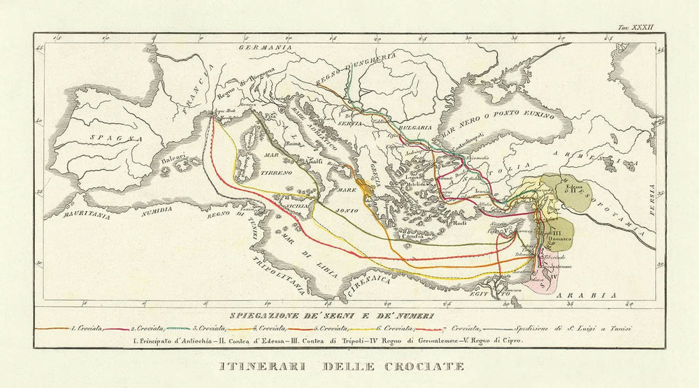 Adéntrese en el rico tapiz de la historia medieval con el "Itinerari delle Crociate", un fascinante mapa elaborado por el prestigioso geógrafo italiano Francesco Marmocchi en 1838. Esta exquisita pieza ofrece una ventana a la tumultuosa era de las Cruzadas, trazando los caminos de las fuerzas cristianas cuando se embarcaron en sus búsquedas sagradas para recuperar Jerusalén. Cada ruta está trazada meticulosamente, revelando los viajes estratégicos por tierra y mar que definieron esta época. Los intrincados detalles del mapa de los reinos y regiones de Oriente Medio brindan una visión fascinante del paisaje geopolítico de la época.