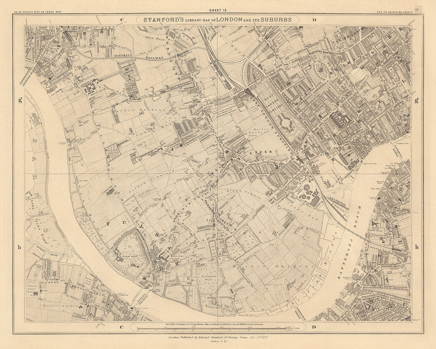 El mapa fue publicado originalmente en 24 hojas. En total, el mapa habría medido aproximadamente 2 metros de ancho (78 pulgadas). Este aquí es la hoja 13, que se centra en el oeste de Londres, específicamente Fulham y West Brompton, con partes de Hammersmith, Chelsea, Battersea y Putney.