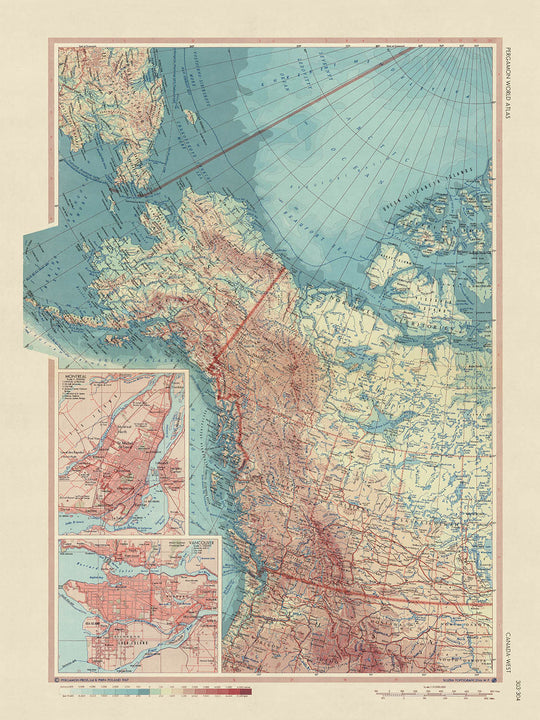 Además del mapa principal, el mapa 'Canadá - Oeste' también incluye insets de Montreal y Vancouver. Estos insets proporcionan una vista más detallada de estas ciudades significativas, destacando su diseño urbano y puntos de referencia clave. La atención al detalle del cartógrafo es evidente en estos insets, que sirven como un valioso complemento al mapa principal. La inclusión de estos insets subraya el compromiso del cartógrafo de proporcionar una representación completa y detallada de Canadá Occidental.