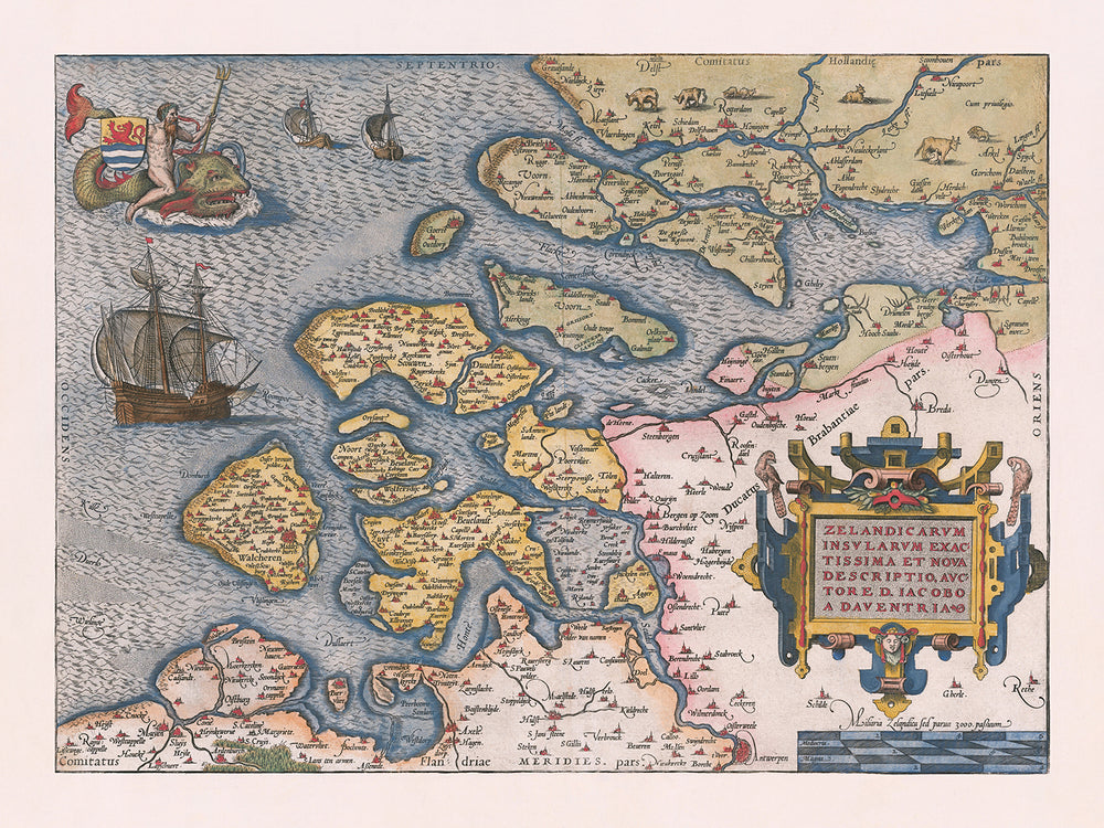 Mapa antiguo de Zelanda por Ortelius, 1584: Rotterdam, Amberes, Delft, Tritón, veleros