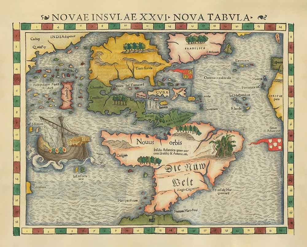 El primer mapa impreso de las Américas, publicado originalmente en 1552 por Sebastian Munster en Basilea, Suiza. Se presenta aquí en condiciones hermosas con un borde completo de latitud y longitud y coloración a mano original.