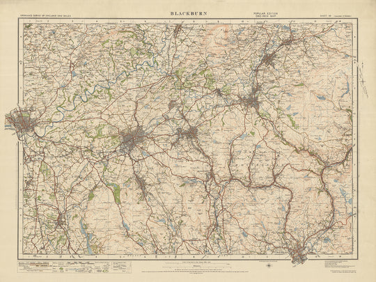 Este mapa antiguo de Ordnance Survey, hoja 30 - Blackburn, 1925, es un fascinante documento histórico que ofrece una visión del pasado de Inglaterra y Gales. Publicado en 1925, este mapa forma parte de la edición "Popular" de una pulgada de Ordnance Survey. Abarca un área que incluye varios pueblos y ciudades notables, como Preston, Burnley, Clitheroe, Accrington y Chorley, además del propio Blackburn.