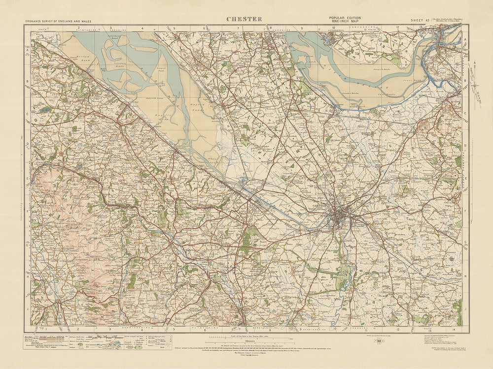 Mapa de Old Ordnance Survey, hoja 43: Chester, 1925: Flint, Widnes, Ellesmere Port, Mold, Clwydian Range y Dee Valley AONB