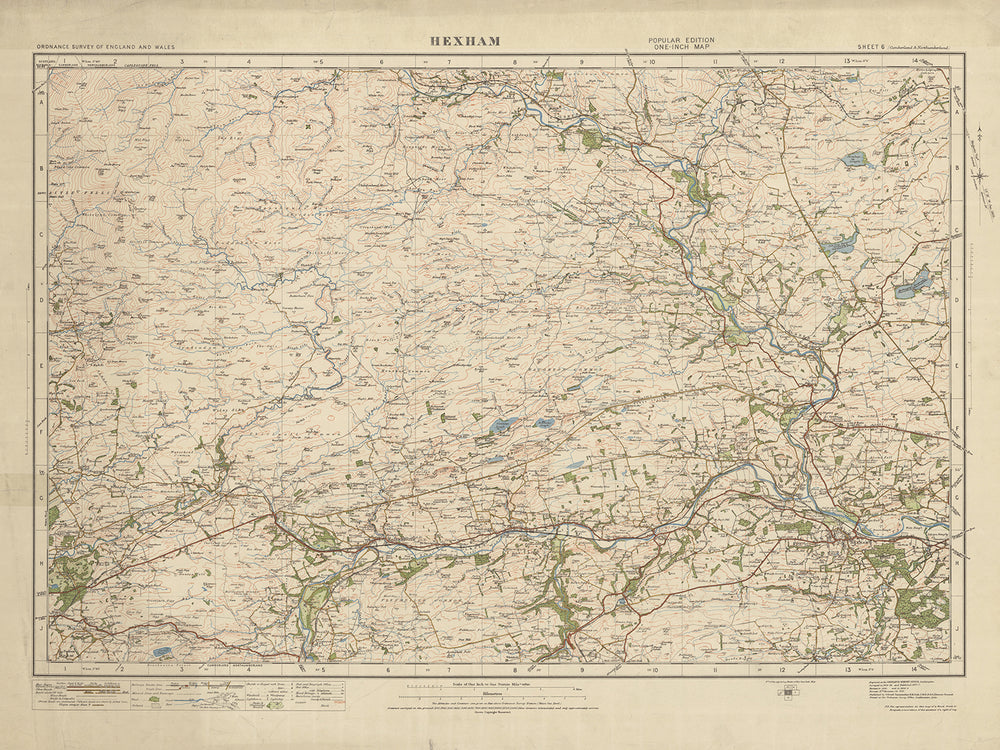 Presentamos una pieza de la historia británica: el mapa "Hoja 6 - Hexham" de la edición "Popular" de una pulgada de Ordnance Survey, una exquisita reproducción del mapa de Inglaterra y Gales de 1919-1926. Esta representación cartográfica ricamente detallada cubre un tramo de aproximadamente 14 millas de norte a sur y una extensión de 21 millas de oeste a este, con la histórica ciudad comercial de Hexham situada en la esquina sureste. El mapa encapsula partes de Northumberland y Cumbria, condados conocidos por sus vastos y escarpados paisajes, monumentos históricos y encantadores asentamientos. Descubre el serpenteante flujo del río Tyne, la belleza elevada de los North Pennines, el contorno marcado del Muro de Adriano y el atractivo del Parque Nacional de Northumberland.
