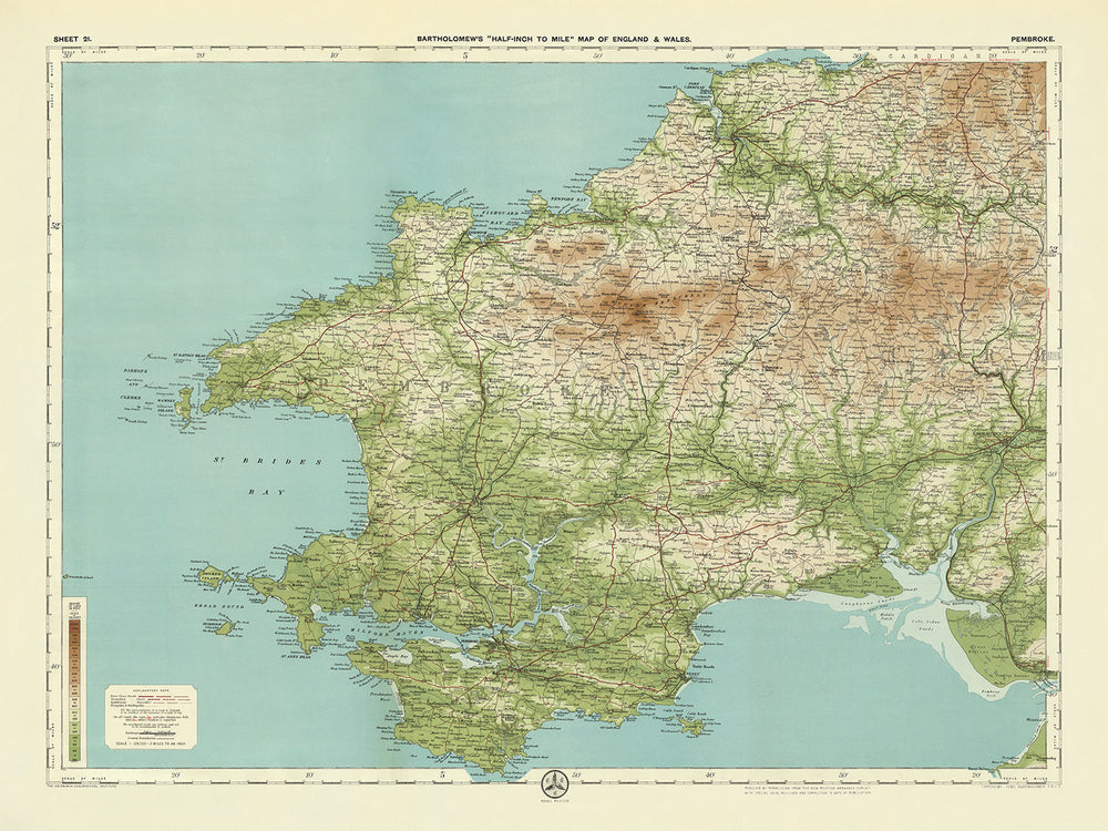 Además de su importancia histórica y geográfica, este mapa sirve como una hermosa obra de arte. La cuidadosa atención al detalle, combinada con el uso innovador del color por parte de Bartholomew, lo convierte en una adición impactante a cualquier colección. Ya sea que seas un entusiasta de la historia, un amante de la cartografía fina, o simplemente alguien que aprecia la belleza del mundo natural, la hoja 21 - Pembroke es una representación cautivadora de una región rica en historia y belleza natural.