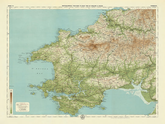 El diseño del mapa es un testimonio de las técnicas pioneras de Bartholomew, utilizando gradaciones sutiles de color para representar el relieve del paisaje. Este método no solo mejora el atractivo estético del mapa, sino que también proporciona una comprensión clara de la topografía de la región. Las diferentes capas de bandas de color representan diversas alturas de terreno, facilitando la visualización de las colinas y valles ondulados de Pembrokeshire. Este diseño, basado en un mapa reducido de la Ordnance Survey, muestra la capacidad de Bartholomew para combinar la precisión científica con la belleza artística.