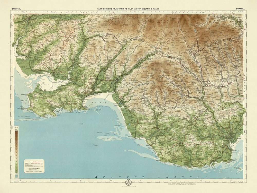La hoja 27 - Swansea, una creación distinguida del renombrado cartógrafo J.G. Bartholomew en 1901, se erige como un testimonio del arte y la precisión de la cartografía de principios del siglo XX. Este mapa, parte de la serie insignia de Bartholomew, fue meticulosamente diseñado para ciclistas y turistas, ofreciendo una representación detallada y visualmente atractiva de la región. La escala de media pulgada por milla (1:126,720) asegura que cada característica, desde la aldea más pequeña hasta los hitos naturales más prominentes, se represente con claridad y precisión, convirtiéndolo en una posesión preciada para coleccionistas y entusiastas por igual.