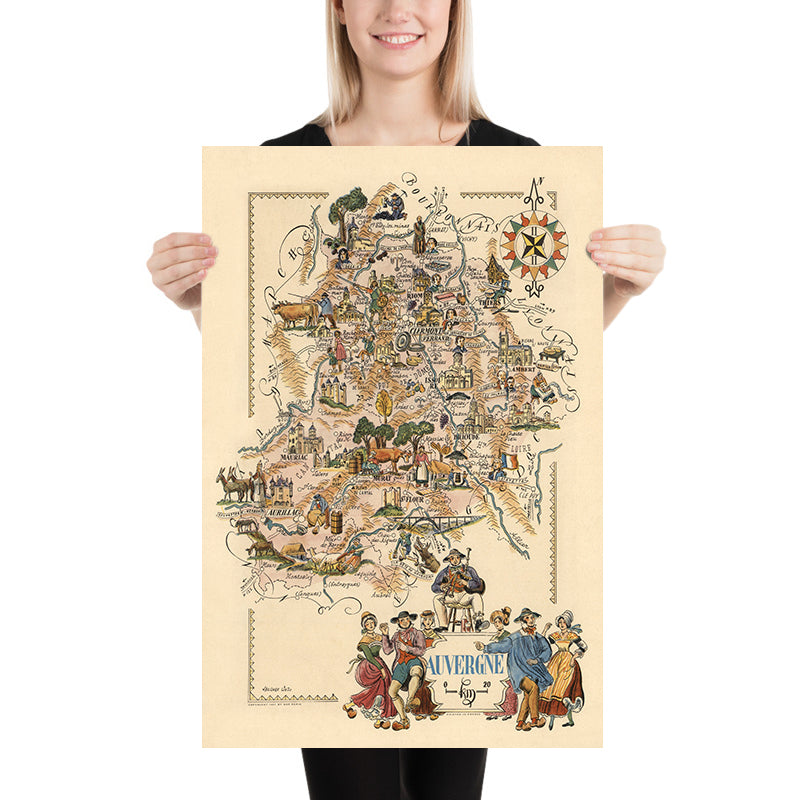 Este mapa destaca las diversas y cautivadoras características de Auvergne, desde sus majestuosas montañas como el Puy de Dôme y el Puy de Sancy hasta sus castillos históricos como el Château de Murol y el Château de Val. La inclusión de estos hitos proporciona un vistazo al pasado histórico de la región, donde la belleza natural y la importancia histórica se entrelazan. El mapa también ilustra el estilo de vida rural y agrícola de la zona, con representaciones de los habitantes locales y sus actividades tradicionales, ofreciendo una ventana a la vida cotidiana de la Auvergne de mediados del siglo XX.