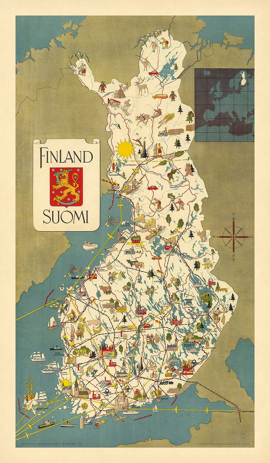 Un examen más cercano revela el rico tapiz del patrimonio natural y cultural de Finlandia. El mapa está adornado con ilustraciones de fauna icónica, como osos y renos, que vagan por las regiones del norte. También presenta diversas escenas industriales y agrícolas, capturando la esencia de la vida y economía finlandesas. Estos elementos proporcionan una ventana a las diversas actividades que han dado forma a la identidad de la nación, desde la silvicultura y la pesca hasta la manufactura y la agricultura.