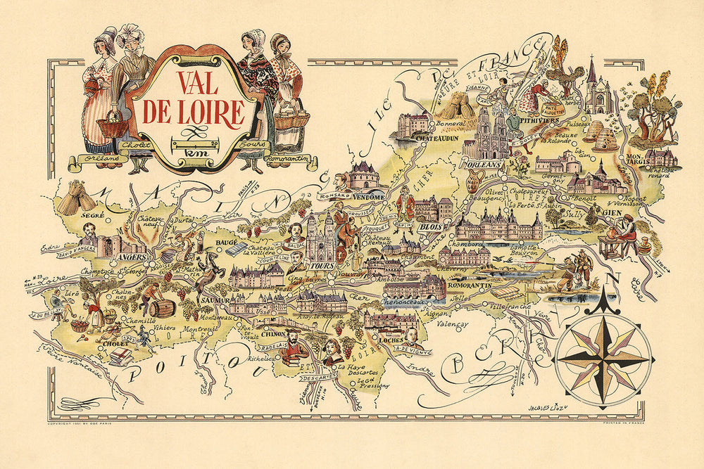 Antigua Mapa Pictórico del Valle del Loira por Liozu, 1951: Orléans, Tours, Angers, Castillos, Viñedos, Vino
