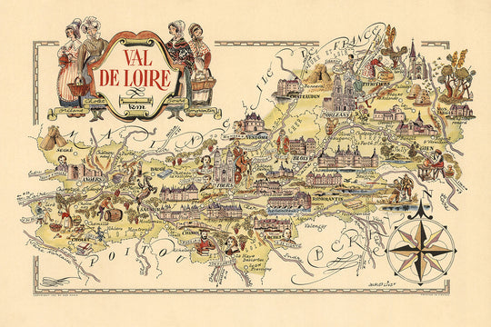 Las ciudades y pueblos del Valle del Loira, incluyendo Orléans, Tours, Angers y Blois, están meticulosamente ilustrados, cada uno con su encanto único y significado histórico. El mapa también captura las actividades agrícolas de la región, escenas de mercado y artesanías tradicionales, ofreciendo un vistazo a la vida diaria de sus habitantes. Esta mezcla de elementos históricos y culturales hace que el mapa no solo sea una guía geográfica, sino también un documento histórico que cuenta la historia del Valle del Loira.
