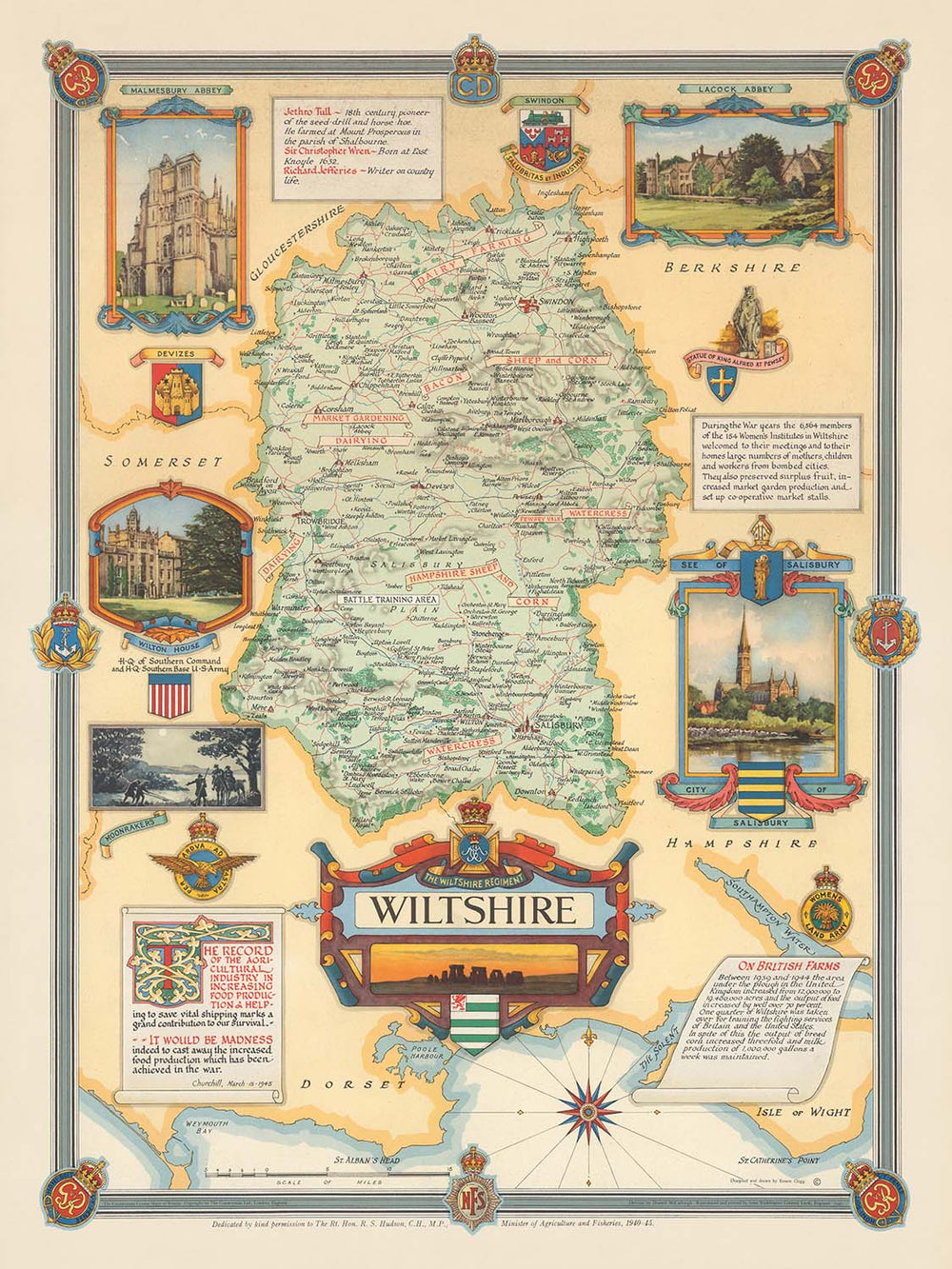 Mapa pictórico antiguo de Wiltshire realizado por Clegg en 1946: Swindon, Salisbury, Stonehenge, Abadía de Malmesbury, Abadía de Lacock