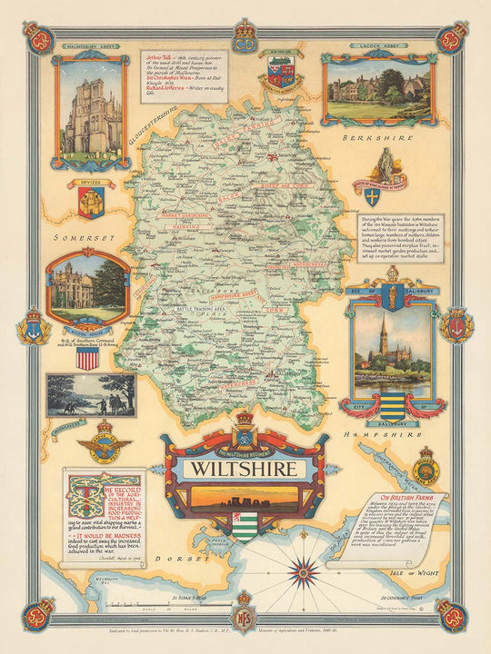 - Contexto de la Segunda Guerra Mundial:El mapa destaca las contribuciones del Ejército de Tierra y los esfuerzos agrícolas en Wiltshire durante la Segunda Guerra Mundial.