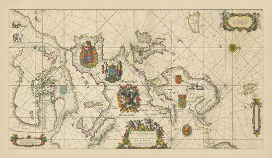 El mapa está adornado con un rico tapiz de emblemas heráldicos, incluyendo los grandiosos escudos de armas de España, Francia, el Sacro Imperio Romano Germánico, y otros más pequeños para Noruega, Suecia, "Ruslandt" (Rusia) e Inglaterra. Estos símbolos de soberanía y poder ofrecen un vívido vistazo al paisaje geopolítico de la época, destacando los dominios marítimos y las rivalidades que influyeron en el curso de la historia europea. La dedicación a Carlos II, Rey de Gran Bretaña, Francia e Irlanda, enriquece aún más el contexto histórico del mapa, vinculándolo al patrocinio real y las ambiciones políticas de la era.