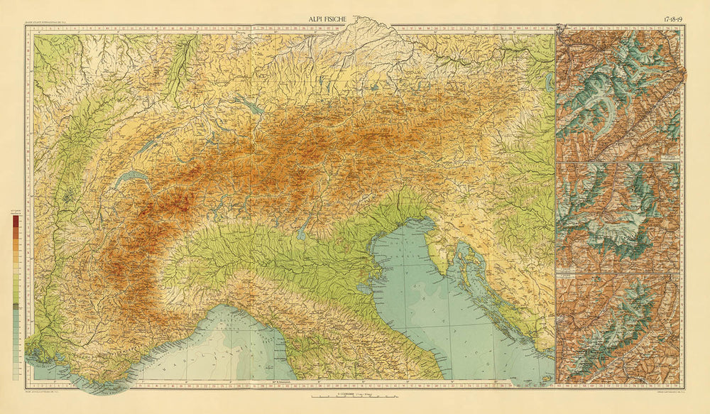 Touring Club Italiano, founded in 1894, is celebrated for its pioneering role in promoting travel and exploration throughout Italy and beyond. Their Cartographic Office, responsible for this map, was renowned for producing some of the most detailed and accurate maps of the era. In "Alpi fisiche," their dedication to excellence is evident in every contour and annotation, reflecting the club’s mission to foster a deeper appreciation for the natural world and to equip adventurers, scholars, and enthusiasts with tools for discovery.