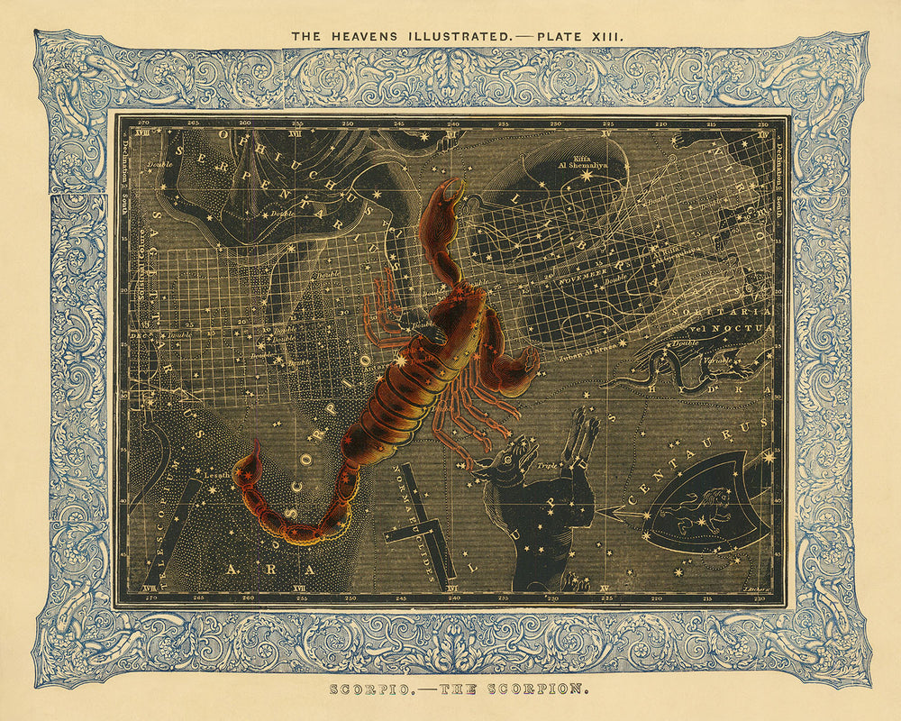 “Escorpio, El Escorpión” es un antiguo mapa estelar coloreado a mano creado por Duncan Bradford en 1837. Este raro mapa celestial traza la constelación de Escorpio y fue una inclusión significativa en el tomo geográfico, "Las Maravillas de los Cielos." Publicado en Boston, esta obra abarcó diversos fenómenos astronómicos, incluyendo el sol, la luna y las estrellas, junto con descripciones cautivadoras de meteoros, cometas y más. Las grabados de James Archer y George W. Boynton son contribuciones notables a su fascinante contenido.