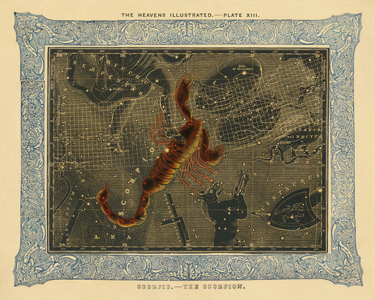 El mapa celestial de Escorpio es resplandeciente con intrincados detalles y coloraciones vibrantes que capturan la esencia del cielo nocturno de una manera que es tanto científica como artística. Ejemplifica la unión del arte y la ciencia que se ve en el trabajo de Bradford, convirtiéndolo en una pieza atemporal para los observadores de estrellas y aficionados al arte por igual. La combinación de datos astronómicos precisos con delicados colores a mano hace de esta pieza una emocionante adición a cualquier colección.