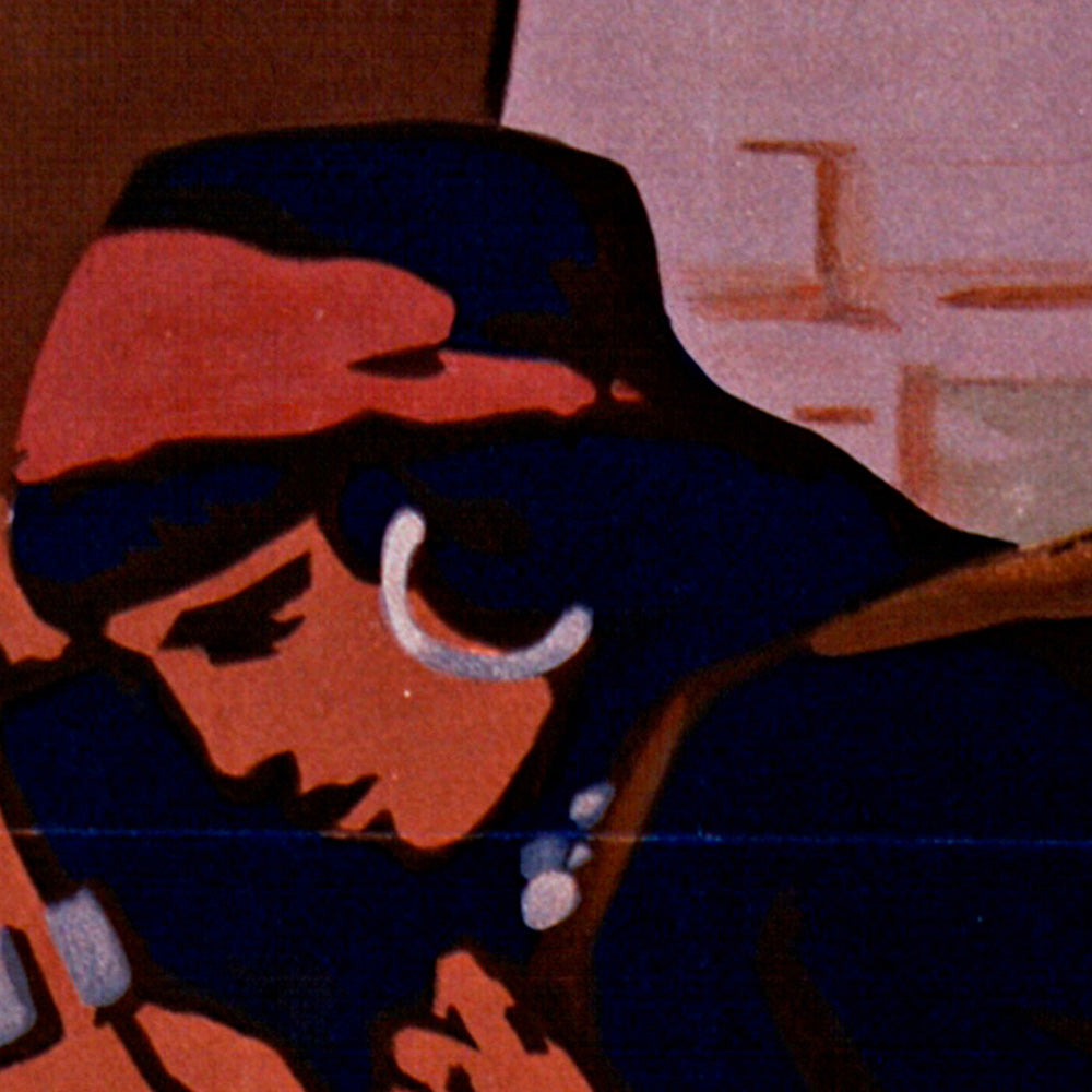 Color and design are the quiet stars here. La Nézière orchestrates a refined palette of deep blue garments, terracotta-brown jars, and a mauve–purple landscape, crowned by a pale green sky. Broad planes of color and simplified forms create a sculptural calm, while the crisp, shadowed sans-serif of VISITEZ LA TUNISIE adds graphic punch. The interplay between the monumental ruins in lilac silhouette and the richly inked figures in the foreground creates depth without fussy detail, making this piece an elegant statement for interiors that favor warm earth tones or cool Mediterranean blues.