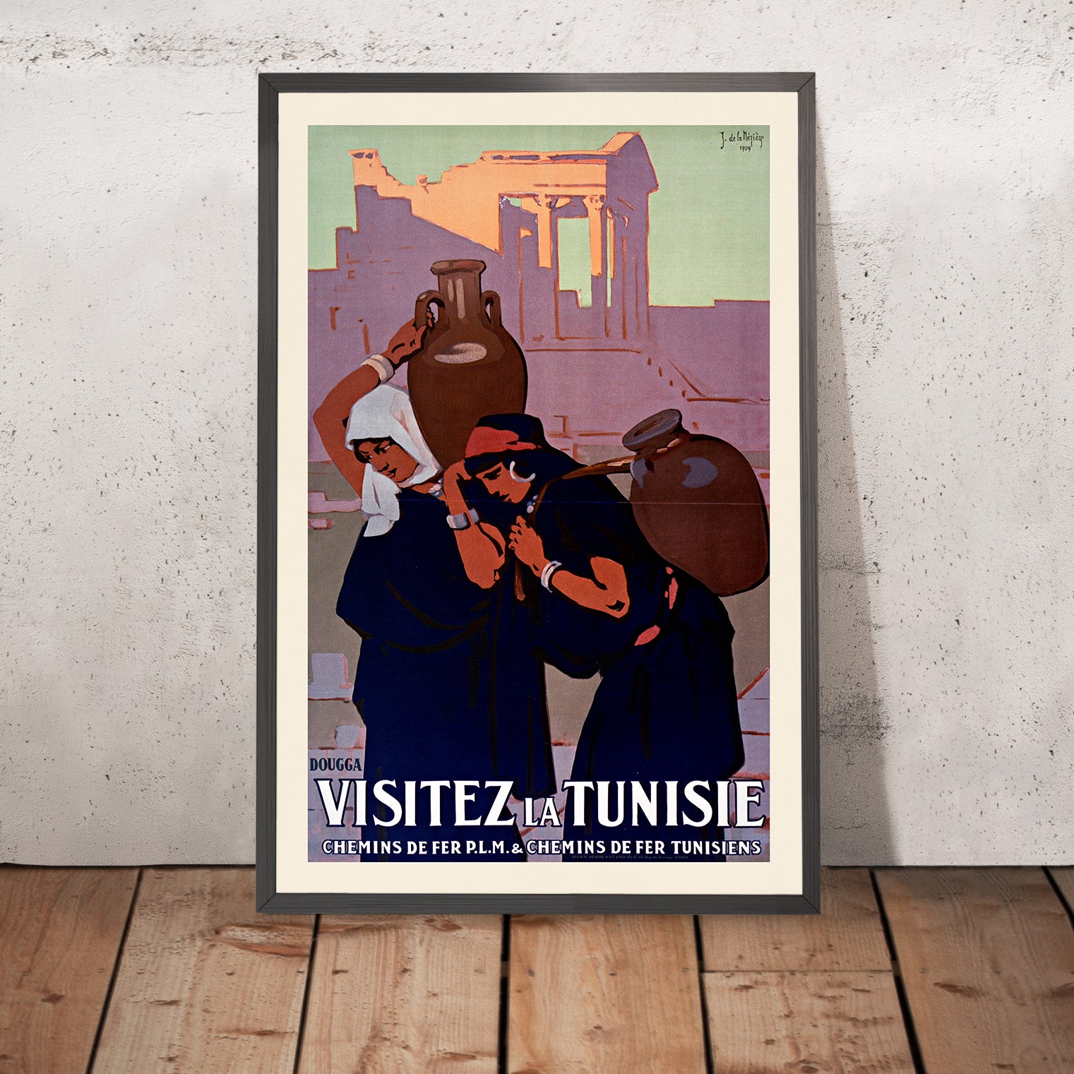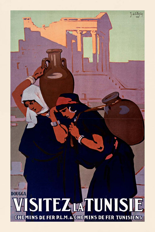 “Dougga. Visitez la Tunisie” by Joseph de La Nézière is a luminous 1929 Art Deco travel poster inviting visitors to the ancient hilltop city of Dougga in northern Tunisia. Designed for the Paris–Lyon–Méditerranée railway and the Tunisian Railways, it marries antiquity with everyday life: two women in traditional dress stride across the foreground with amphorae balanced on their shoulders while the colonnaded ruins of Dougga’s Roman Capitol rise behind them. The artist’s signature, “J. de La Nézière 1929,” appears at the upper right, and the bold title VISITEZ LA TUNISIE anchors the composition in classic shaded lettering.