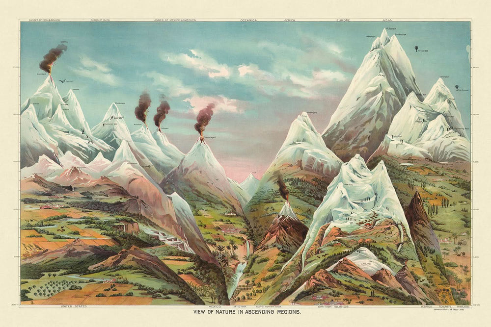Vista de la Naturaleza en Regiones Ascendentes de Levi Walter Yaggy es una ilustración ejemplar de 1893 que captura la grandeza del mundo natural a través de una vibrante cromolitografía. Yaggy, conocido por sus grandes gráficos educativos, creó algunas de las ayudas didácticas más visualmente impresionantes del siglo XIX. Esta obra en particular es una brillante representación de su habilidad para usar el color y el contraste para dar vida a escenas geográficas y naturales en entornos educativos.
