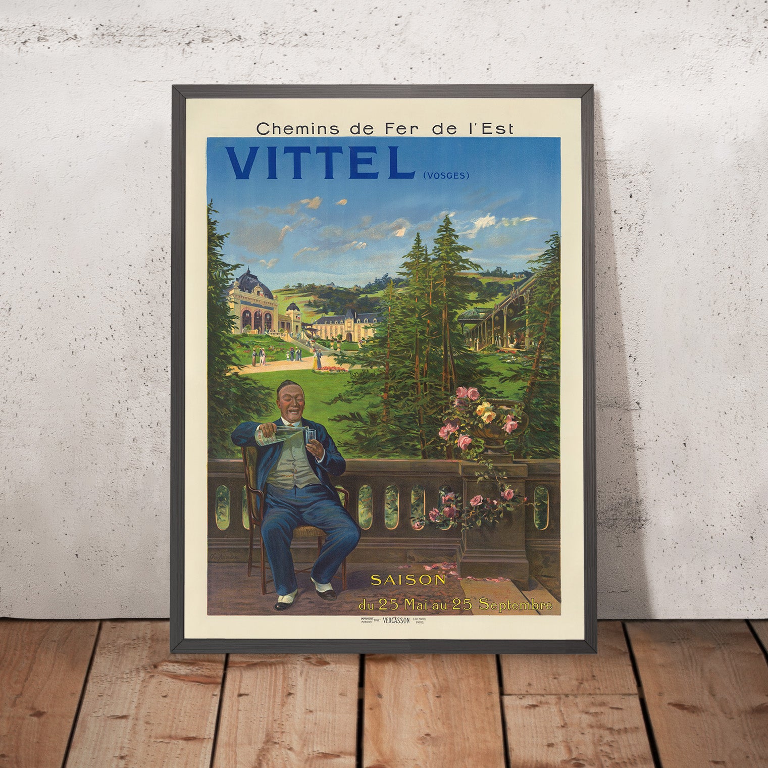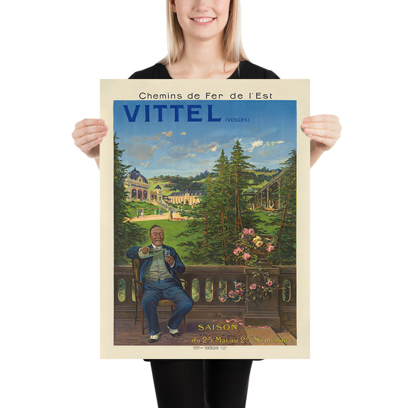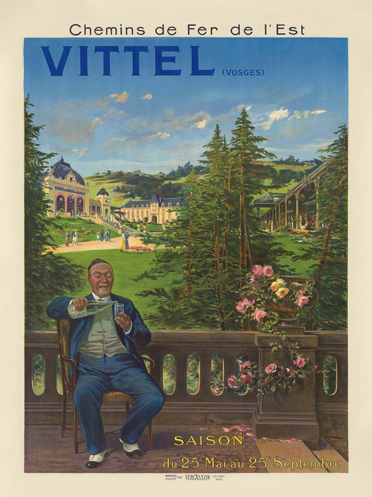 About the place: Vittel rose to renown for its mineral springs and therapeutic “eaux,” drawing visitors to its parkland promenades and grand hôtels. The Chemins de Fer de l’Est made these pleasures accessible, transforming a journey into part of the experience and helping to define the era’s culture of healthful leisure. For travelers who have wandered the Vosges or sipped Vittel’s waters, the poster is a graceful reminder of that world of belle époque elegance and fresh-air afternoons. Indeed, the man in the poster is drinking a glass of Vittel water.