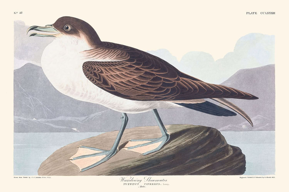 John James Audubon, uno de los naturalistas y pintores más destacados de Estados Unidos, es famoso por su amplio estudio de las aves americanas. Su serie Birds of America, compuesta por 435 grabados coloreados a mano, sigue siendo una de las mejores obras ornitológicas del siglo XIX. La pardela errante, también conocida por su nombre científico Puffinus cinereus, es una de esas ilustraciones que reflejan la dedicación de Audubon a la hora de capturar los intrincados detalles de la vida aviar.