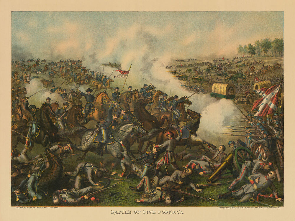 La bataille de Five Forks était cruciale pour son rôle dans le signalement de la défaite imminente des forces confédérées et la reddition subséquente à Appomattox. L'œuvre transmet magistralement l'énergie chaotique et les réalités brutales de la guerre, manifestant à la fois le courage et la turbulence de l'époque. La technique avancée de chromolithographie utilisée a permis une représentation riche et complexe, faisant de cette œuvre un accomplissement technologique significatif du 19e siècle.